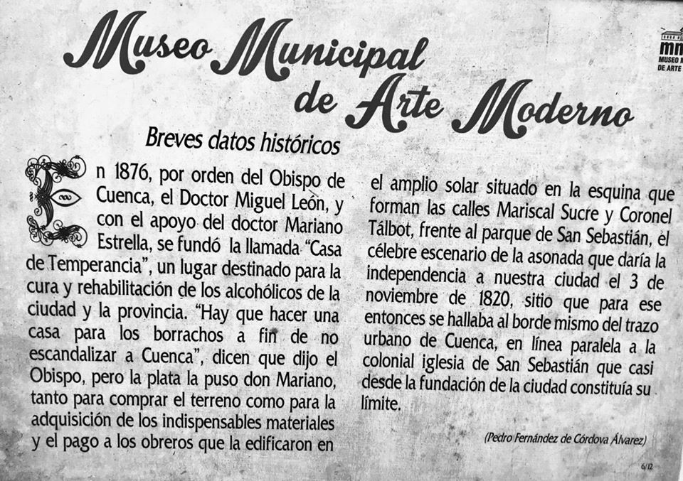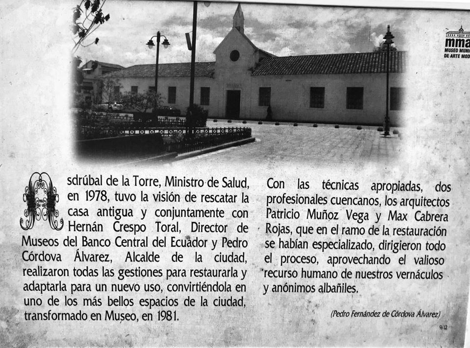 Luis Crespo Ordóñez, a famous Cuenca painter, proposed and supported the creation of a Museum of Modern Art. In 1978 both the Central Bank of Ecuador and Cuenca City Council, under the mayor Dr Pedro Córdova, pledged their support to the project. The restoration works were directed by the architect Patricio Muñoz Vega, and on 1 August 1981 the museum opened to the public.