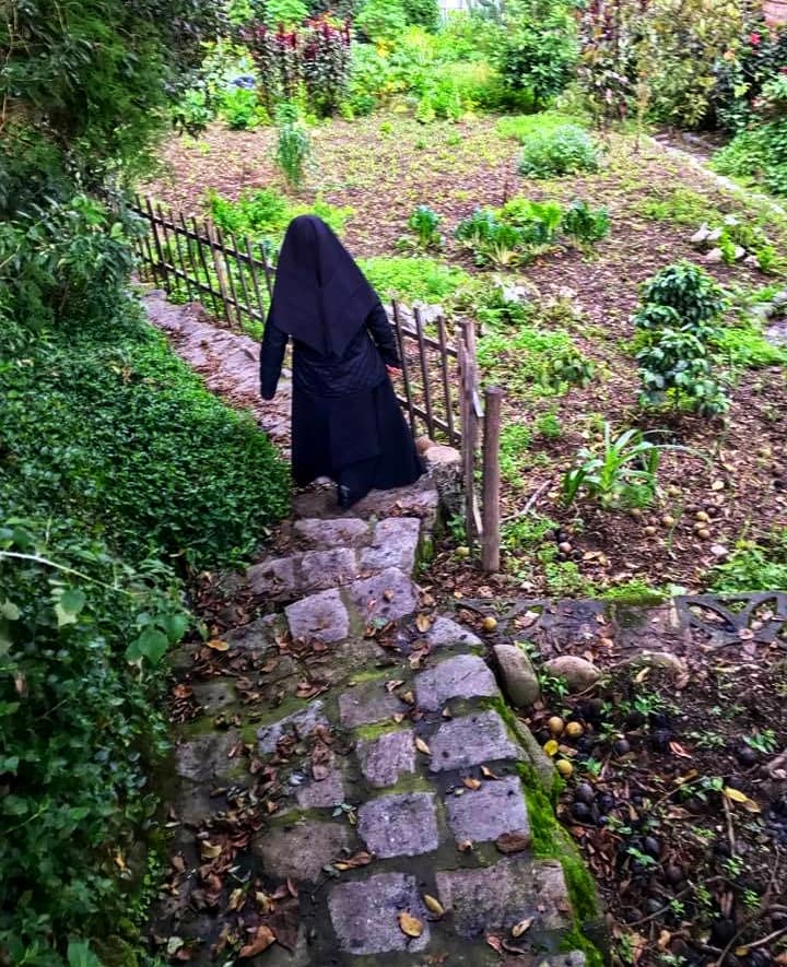 Sister Ruth is giving a tour of the garden. The rear garden facing the Tomebamba River is a well tended native garden, where the stone terraces built by the ancient Canaris are visible again, and provide a backdrop and support for the walkways and planting beds filled with herbs, and organic fruits and vegetables, oregano, cedron, dill, cilantro, celery, and colorful flowers.