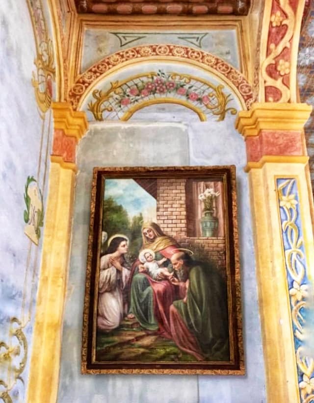 Note the curved contours of the adobe/bahareque walls. One of the murals that was discovered hidden for many years under layers of white-washed paint, and restored in place.