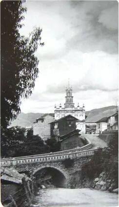 Todos Santos at night from the Tomebamba River. Photo on the right is from the 1950’s of the Iglesia, and Bajada de Todos Santos.