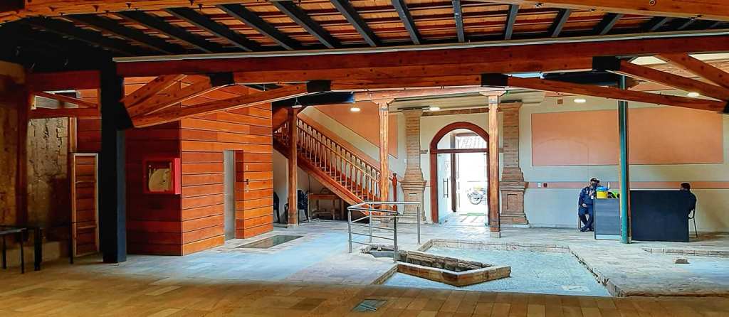 During the restoration of the building, several ancient city water canals were uncovered underneath the flooring. These have been carefully restored, and can be seen flowing under the first level of the house.