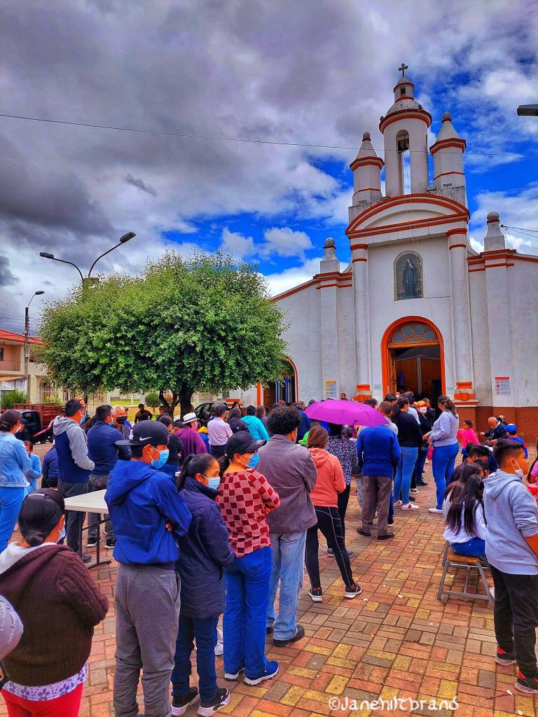 crowds waiting in line to be fed Fanesca, on Good Friday, at Santa Marianita del Arenal.