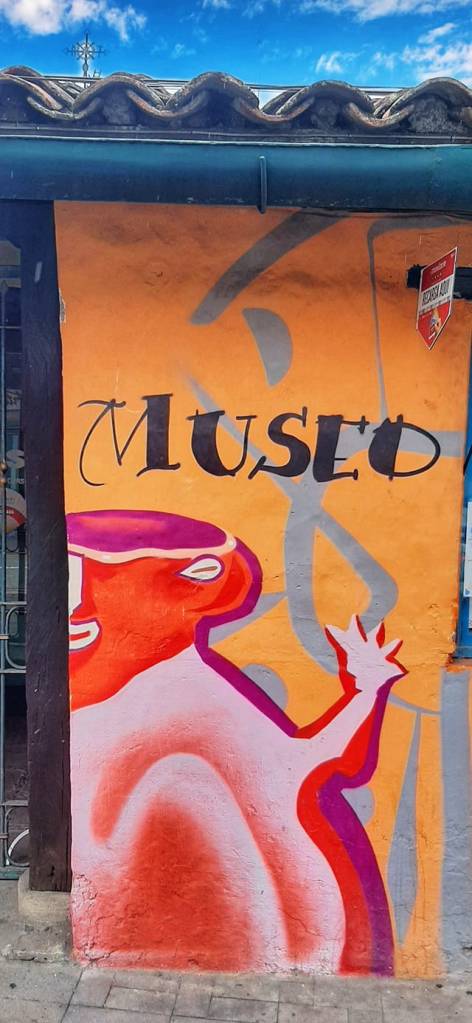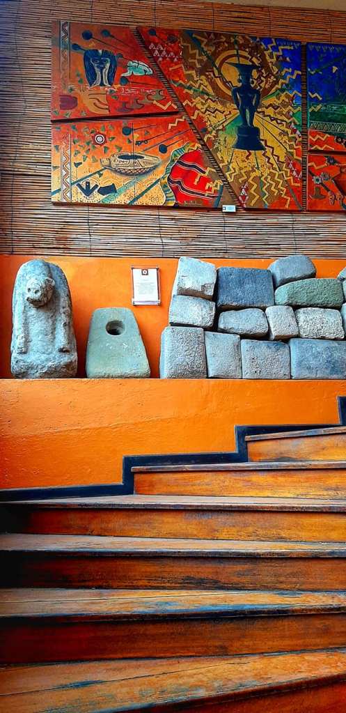 On the wall facing you as you enter is a large format wall painting by Marco Martinez Espinoza. The theme is “La Huelga de La Sal ”, an uprising of the indigenous people of Azuay and part of Cañar, who in 1925 surrounded the city of Cuenca, in protest at the hoarding of salt and its speculation