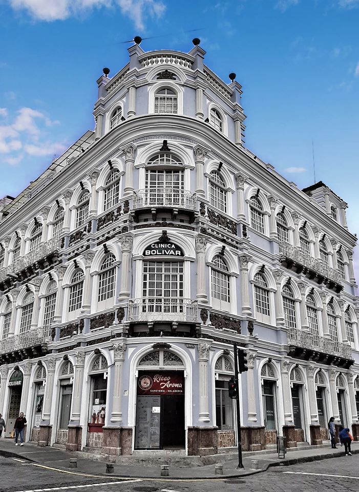 The French style facade of this building dominates the northwest corner of Calderón Square, displaying a design attributed to the German Redemptorist monk Juan Bautista Stiehle. The first owner, Manuel Arce Torres, who exported straw Panama hats, lived on the outskirts of the city in the El Vecino district, and conceived the building to accommodate living quarters for his family on the upper floors and commercial premises on the ground floor.