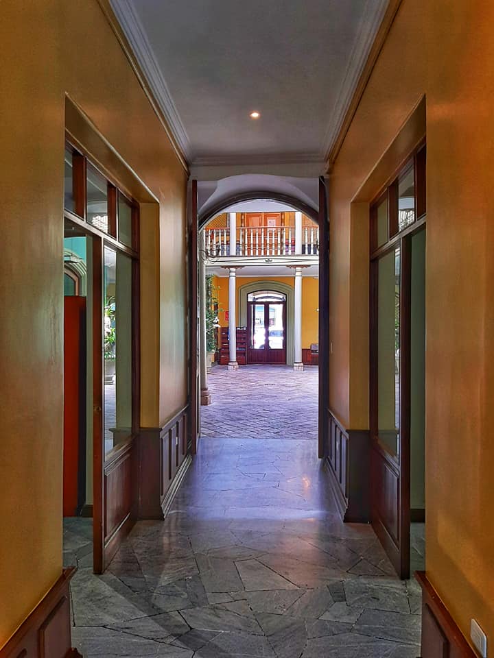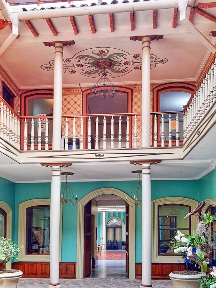 This corner building was constructed by Manuel Felipe Ullauri for his family. It is very similar in materials, design and style to the Manuel Arce Torres House on the same street overlooking Parque Calderon.